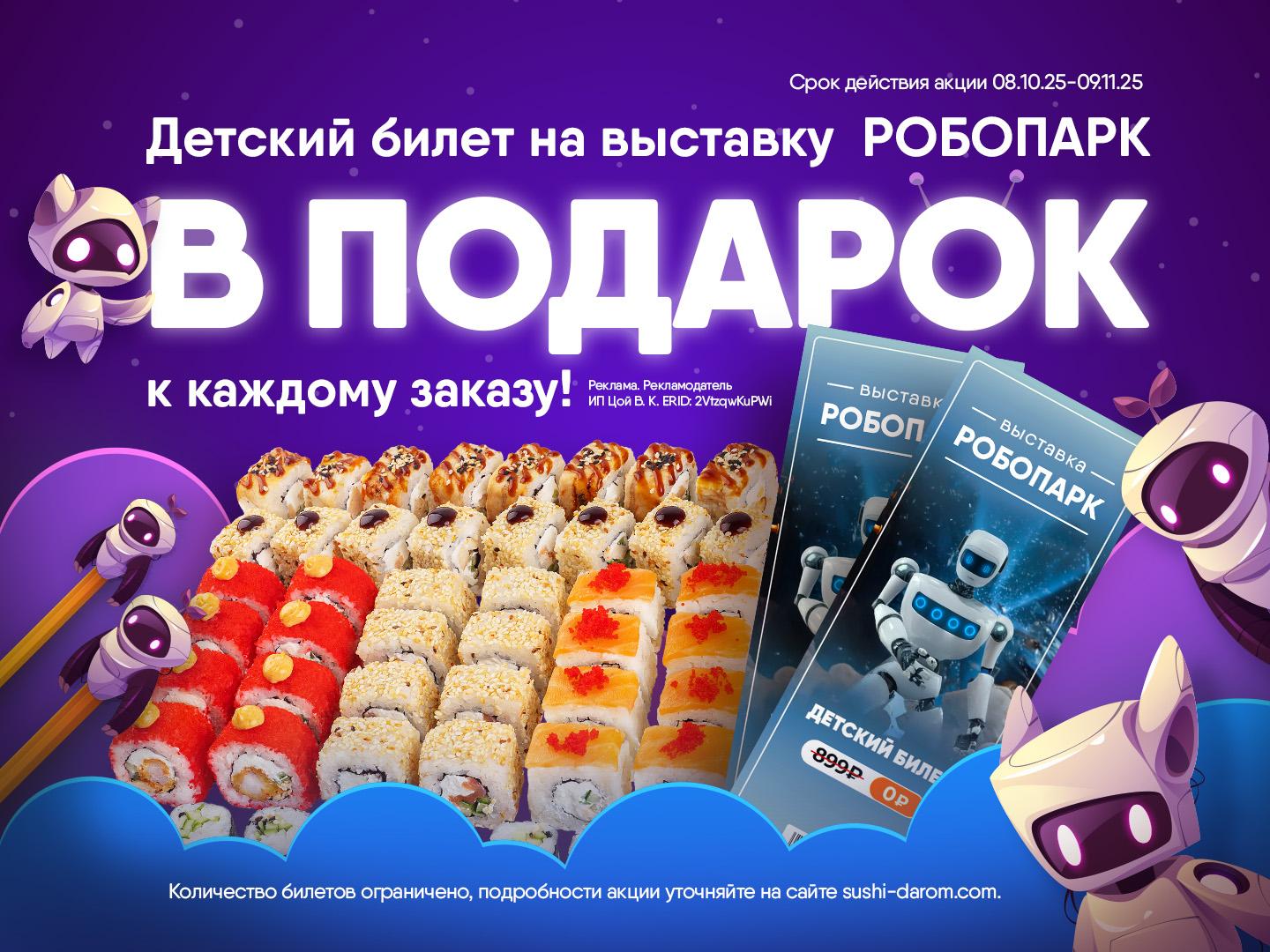 [emoji=:orange_heart:]Время открывать новые миры![br][br]Сделайте заказ любимых роллов и получите бесплатный детский билет на невероятную выставку![br][br]Супергерои для детей, вкус – для вас![br][br]Сроки акции: С 8 октября – 9 ноября 2025 г.[br]Количество билетов ограничено.[br][br]Не упустите шанс порадовать себя и детей!